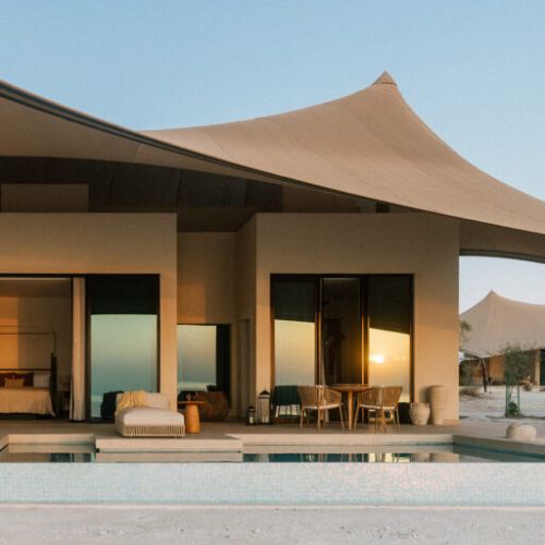 The Zekreet Villa combines two neighboring villas, offering extra space, two private plunge pools, and a large deck. It’s a great option for families or friends who want to stay together while still enjoying privacy and comfort.